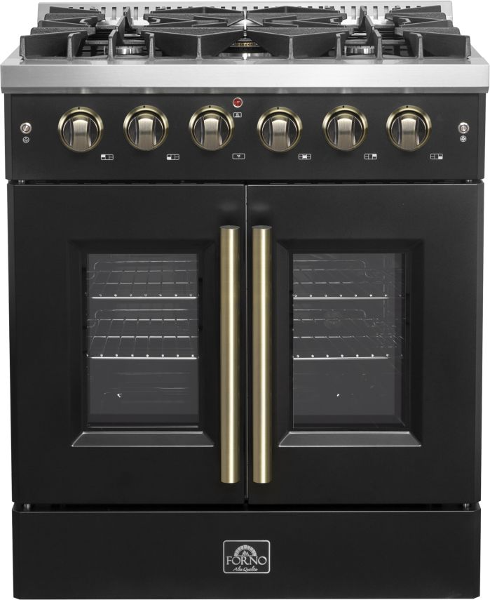 The Forno Galiano 30" French Door Gas Range in black brings professional styling and performance into your home kitchen at an affordable price. Enjoy effortless access to your oven with French doors that offer an extra 12 inches of space.Read More