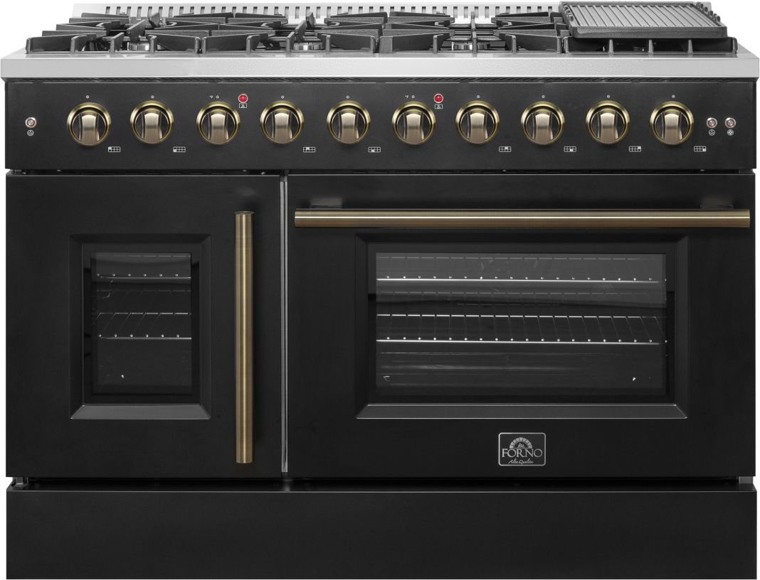 The Forno Galiano 48" French Door Gas Range in black brings professional styling and performance into your home kitchen at an affordable price. Enjoy effortless access to your oven with French doors that offer an extra 12 inches of space.Read More