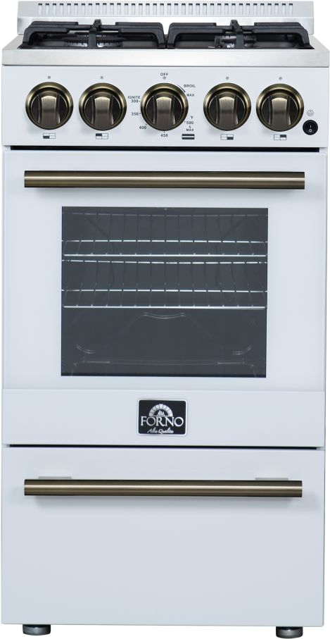 The Forno Lamazze 20 Inch Freestanding Gas Range in White adds a bold look and professional performance to compact kitchens. It features four sealed burners with a total output of 21,200 BTU and heavy-duty cast iron grates. The 2.05 cu ft gas oven delivers 13,000 BTU for baking and broiling, with an internal cooling fan for even heat. Includes two electroplated racks, LP conversion kit, and power cord. Finished with durable black steel and zinc-coated knobs, this range offers precision control in a space-saving design.Read More