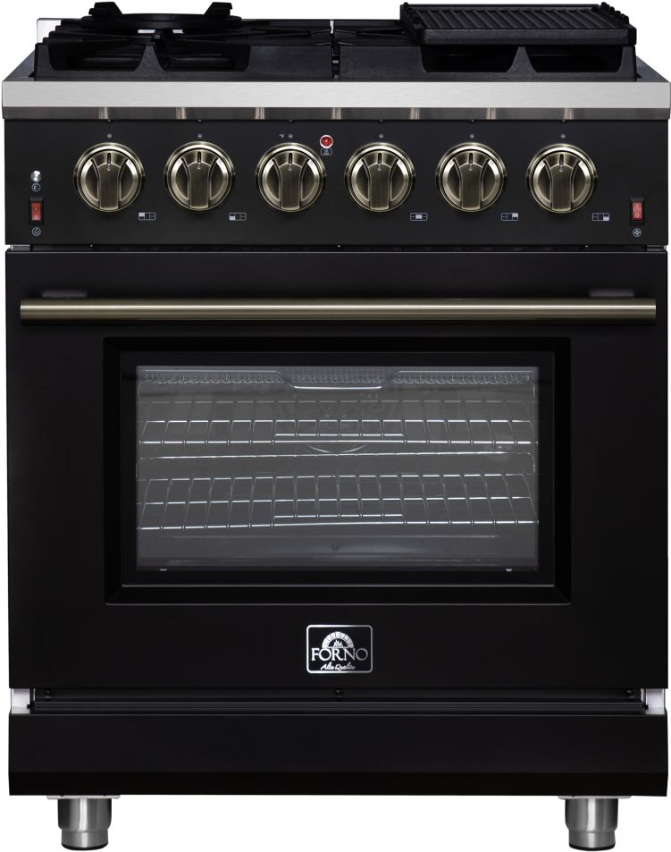 The Forno Massimo 30 Inch Gas Range harmonizes professional style and durability with antique brass. Its 5 sealed burners, totaling 68,000 BTU, include a precision 20,000 BTU dual-ring burner that can simmer at 1,000 BTU. Continuous cast iron grates ensure stability on the enamel surface.Read More