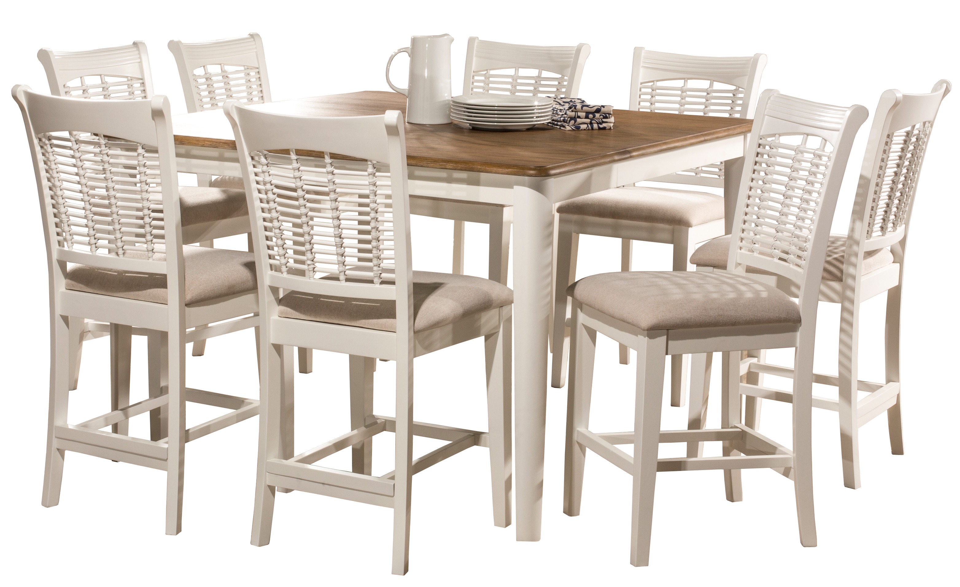Finished in white and topped with a solid hardwood table top with driftwood finish. Featuring an extendable table top. This two-toned collection complements any décor. Complete with a counter height extension table and eight non-swivel stools designed for your comfort with perfectly placed foot rests and off-white woven upholstered seats. Assembly required.