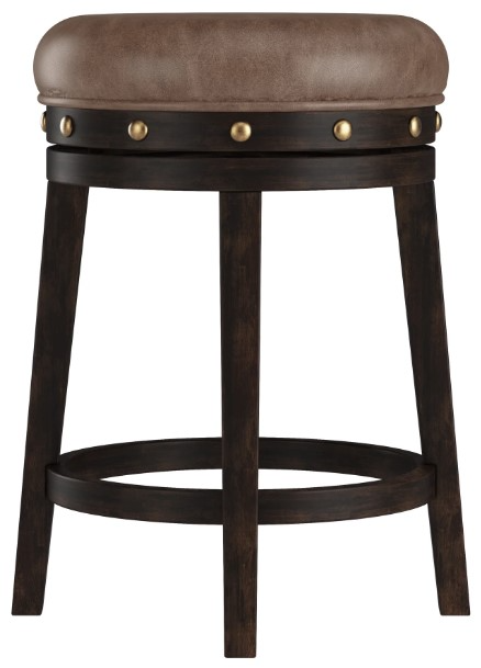 Features a round, 360° swivel seat upholstered in a polyester blend weathered dark brown faux leather