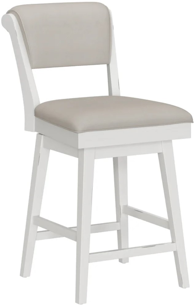 A classic silhouette is elevated with an on-trend white finish wood frame and fog gray upholstery. A roomy -- and comfy -- square padded seat sits perched atop a 360-degree swivel mechanism while a perfectly placed footrest guarantees comfort at every turn. Assembly required.