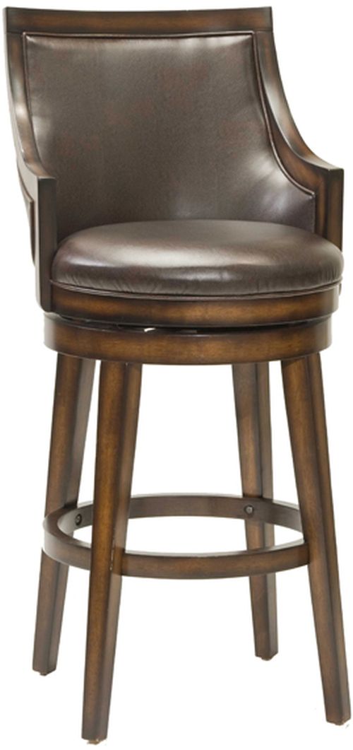 Traditional with a contemporary edge, the Hillsdale Furniture Lyman swivel stool is a handsome addition to any bar or kitchen area. Gently sloping arms compliment the square back and tapered legs while durable brown vinyl cover the seat and back. A rustic oak finish, with burnished edges, completes the look of this stunning stool. Constructed of hardwood with veneer.Read More