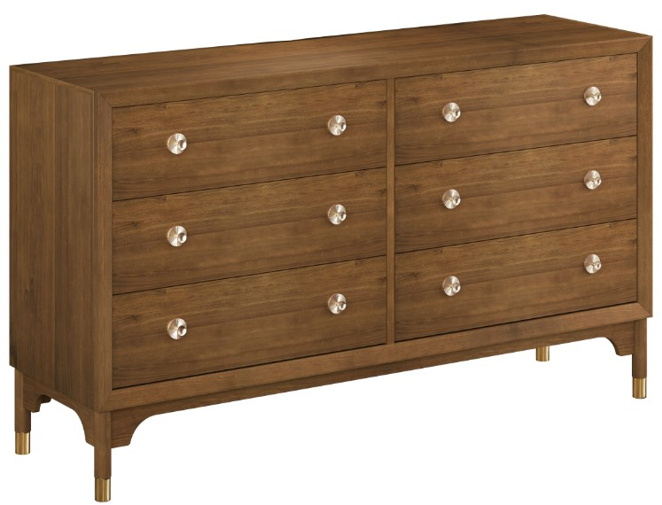 Crafted from wood, this charming walnut dresser offers an ample top surface for display, six drawers featuring English dovetail construction for durability and maximum space, plus matte gold knobs on each drawer for attractive, easy access. At the base, find gold caps on each of this dresser's four legs for a final pop of mid-century appeal.