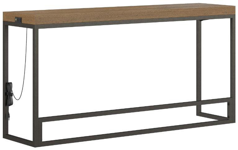 This counter height sofa table boasts clean lines and a sleek mixed-media design. The wooden tabletop features a vibrant, textured wood grain that peeks through a light brown finish, while the heavy-gauge metal base is finished in a brushed bronze with black undertones.Read More
