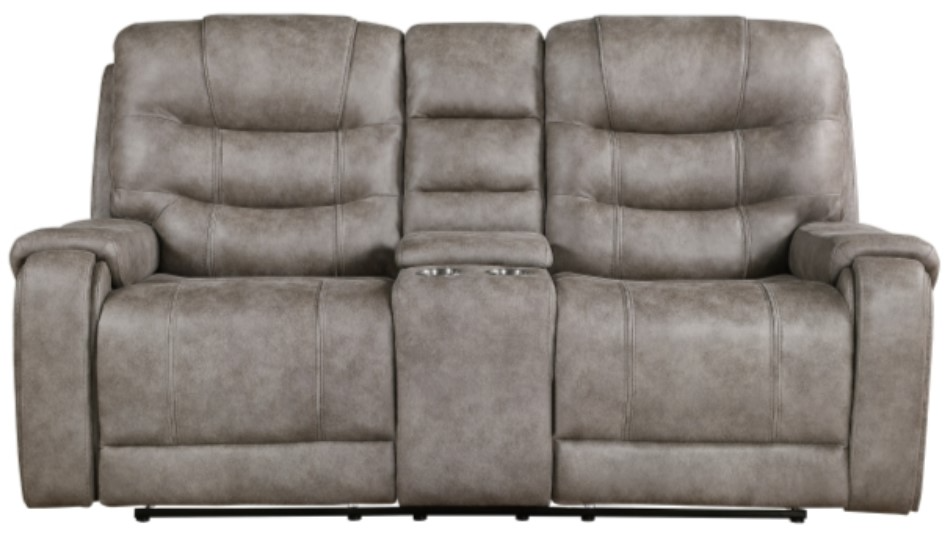 Manual motion mechanisms allow for your reclined experience and are engaged with a pull of the side mounted tab. Grayish-brown polished microfiber covers the collection, its neutral hue offering a warm balance to your living room’s décor.