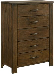 Expanding the functional storage space in your bedroom, the Sullivan Collection provides ample drawers and shelves to achieve your desired bedroom design. The wire-brushed oak finish over mindy veneer lends subtle rustic aesthetic to the chest while dark brown metal bar hardware provides complementing accent to the drawer fronts.Read More