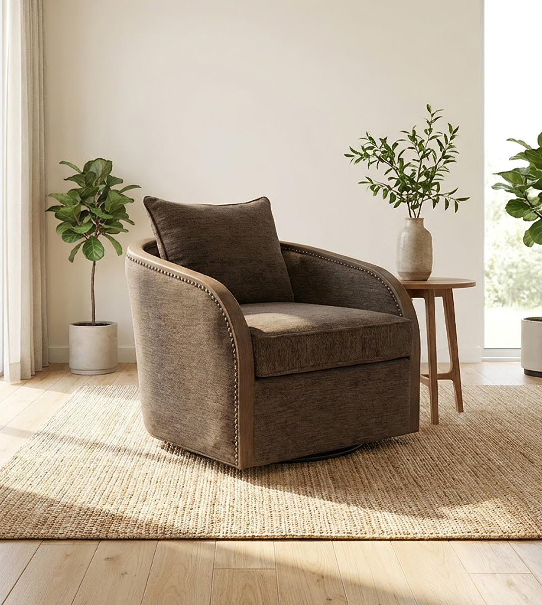 Swivel accent chair in a Chocolate fabric with nailhead trim.Read More