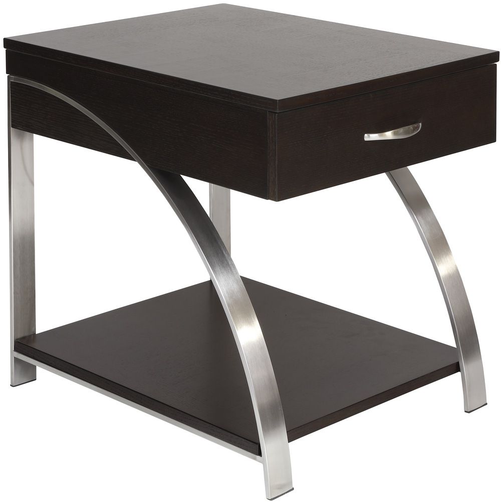 Designed for the modern home, the Tioga Collection will provide a unique look for your living room. Brushed chrome geometric support legs provide a distinct contrast to the espresso finish of the table tops and display shelves in this occasional grouping.Read More
