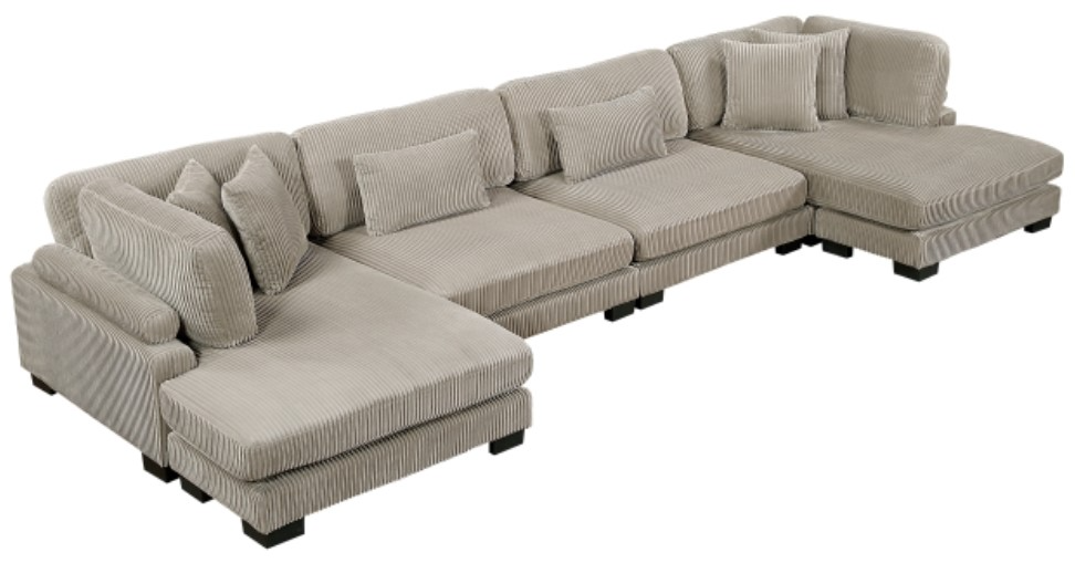 Configurable to your available space, the Traverse Collection allows for the addition and detachment of pieces for a customized seating experience. The 4-piece sectional configuration consists of two armless chairs with two chaises. The taupe corduroy fabric upholstery creates a plush expanse for a soft touch experience.Read More
