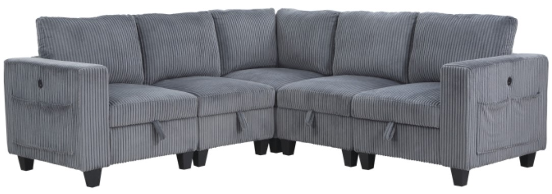 Pull-out storage drawers are neatly tucked beneath the armless chairs, and end seats of the sectional, each drawer easily accessible with a pull to the front-mounted loop handle. The corner seating unit of the sectional is anchored by two armless chairs while the two end seat’s arms provide side support and power charging ports. The collection is covered in dark gray corduroy fabric for a neutral complement to your home’s décor.
