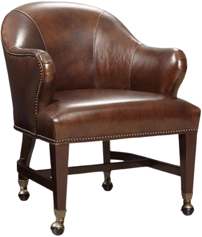 The stylishly shaped Queen Game chair silhouette brings class and comfort to game nights. Designer details include a camel-shaped back, goose-neck-shaped arms with tailored pleating and nailhead accents around the base, sides, and back. Covered in the luxurious Isadora coffee aniline top-grain leather, the legs and stretcher are finished in natchez brown.Read More