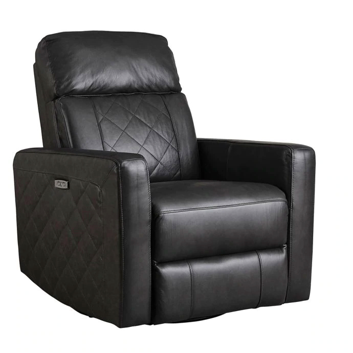 Power recliner with swivel and gliding motion and USB charging port in a brown leather upholstery and accent stitching.Read More