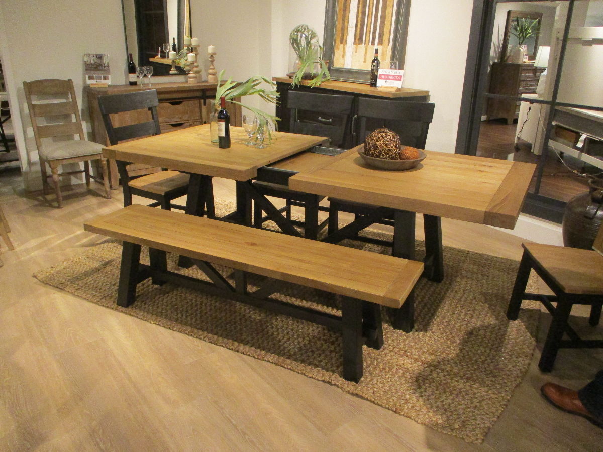 Rustic 2-tone dining set features trestle base table with ball bearing glide self-storing butterfly leaf and 4 matching side chairs.Read More