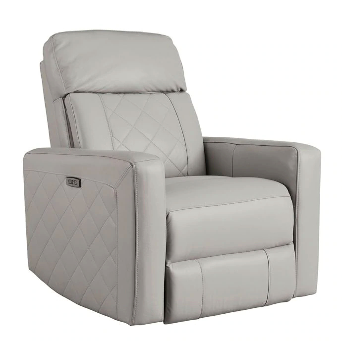 Power recliner with swivel and gliding motion and USB charging port in a gray leather upholstery and accent stitching.Read More