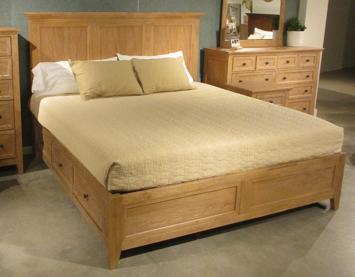 Solid wood queen panel bed in a wheat finish with storage bed rails. A gorgeous bedroom set that will last in function and style.Read More