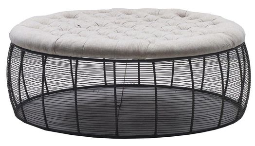 The "wire basket" frame of this versatile ottoman is constructed, using MIG welding joint methods, of black powder coated cast iron. The button tufted upholstery is a neutral poly/cotton blend. The ottoman large enough to also function as a coffee table.