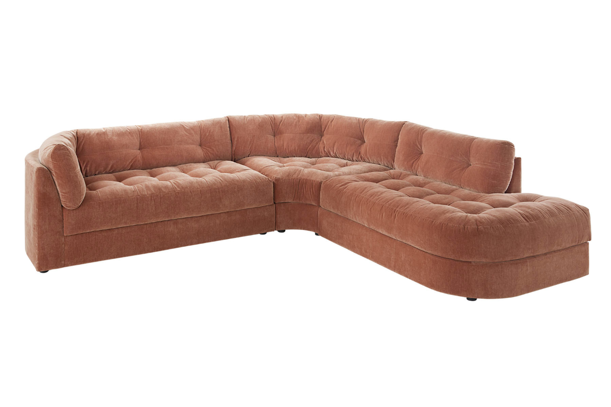 Beautifully blending modern appeal with vintage charm, the Juniper collection's sink-right-in comfort will create an inviting backdrop for your family and friends to gather. This 3-piece sectional with left-facing bumper chaise is covered in a warm and bold amici ginger color while its eye-catching tufting and deco-inspired curves makes it look good from any angle.Read More