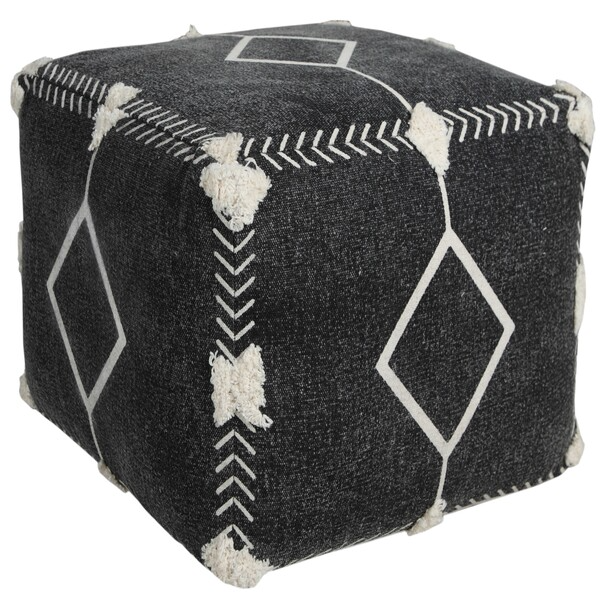 Add a touch of modern boho charm to your space with this stylish black pouf ottoman. Featuring a bold white diamond and chevron stitched design, this cube-shaped accent piece is both decorative and functional.Read More