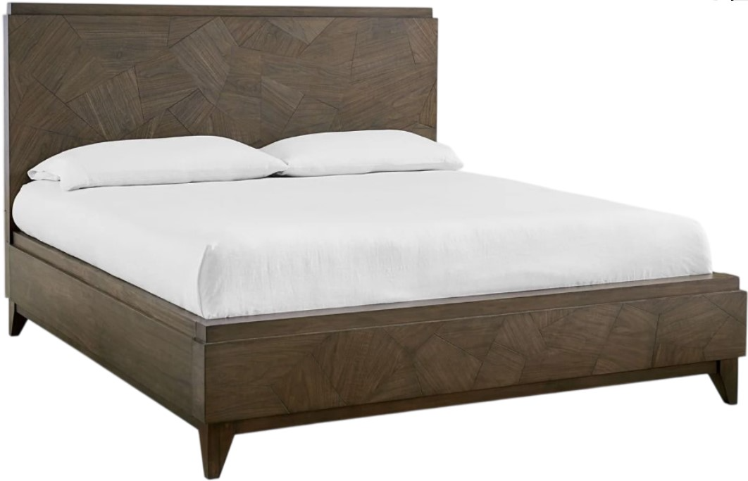Random angularity meets straight-lined minimalism in this distinctively modern bedroom. Figured Black Walnut veneer patterns are simultaneously juxtaposed with stairstep moldings and mirrored in angular tapered feet. A true medium walnut finish with a matte lacquer top coat lends itself to mid-century and maximalist decor.Read More