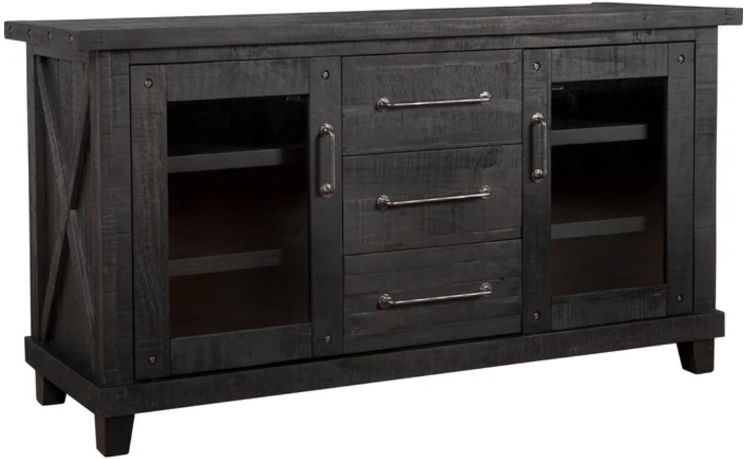 A rustic black pine finish balances transparency and opacity to showcase these natural imperfections. Exposed bolts, hammered metal pulls and cross-braces evoke the ingenuity and earnestness that characterized the turn of the century. Built with convenience in mind, the Yosemite dining table is offered in rectangular and round configurations. Each design is constructed with an 18" or 20" leaf extension and features mortise and tenon joinery, tongue and groove table top framing and angled cross-bracing. Dining chairs are available with upholstered and wood backs, and feature solid wood legs, individual nail head trim, linen upholstery and full web suspension for hours of dining comfort. The 65" sideboard completes the collection with three levels of storage behind glass-paneled doors and three spacious drawers with hammered metal bar pulls, ball bearing glides and English dovetail joinery. Equally suited for an industrial downtown loft or a suburban farmhouse, the Yosemite dining collection blurs the lines between contemporary and rustic. The collection's black pine finish works well with concrete or dark hardwood floors and plush neutral or bold rugs. Zinc metal accents complement nickel or chrome kitchen accents and contrast well with bronze color tones. Neutral or bold wall colors provide a great contrast to the wood finish, making this collection a perfect choice for any lifestyle.