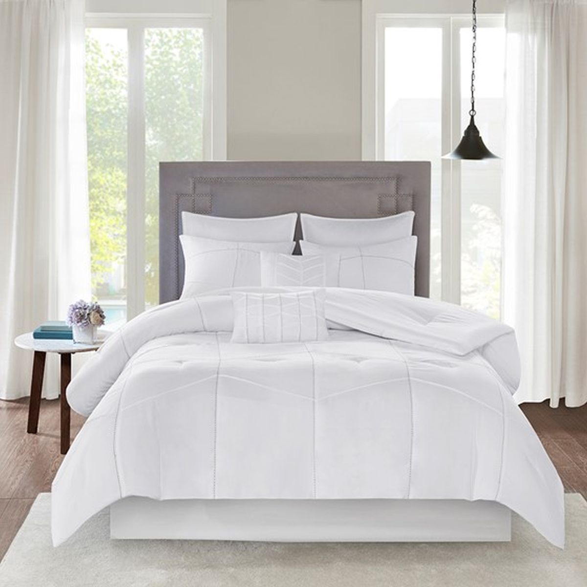 Transform your bedroom with the simple and refined style of 510 Design’s Codee 8 Piece Comforter Set. The solid white comforter and shams feature pintuck details with decorative stitching that add dimension to the top of the bed, for a chic contemporary look. Two Euro shams complement the comforter, while two decorative pillows with fabric manipulation and embroidered details add texture and charm to the bedding set. A solid white bedskirt completes the ensemble by providing a clean finishing touch. Made from ultra-soft microfiber, this comforter set is machine washable and brings a modern flair to your bedroom decor.