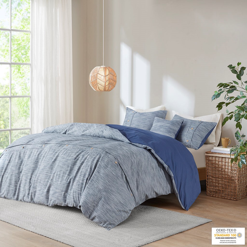 The Clean Spaces Dover 5 Piece Organic Cotton Comforter Cover Set with a removable insert offers a refreshing update to your bedroom. This organic cotton comforter cover features button placket details on the soft indigo fabric, for a modern farmhouse look.Read More