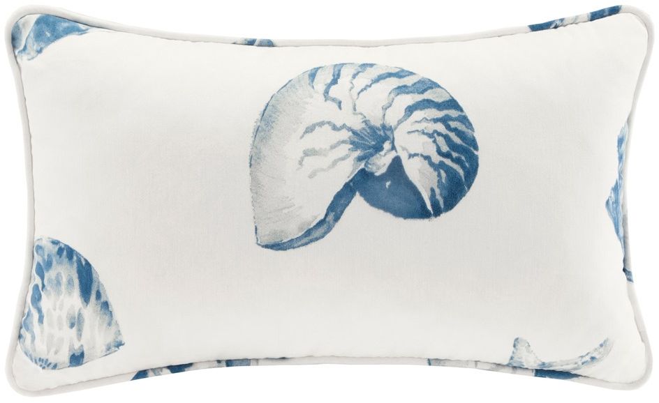 Features shell pattern printed in shades of blue.