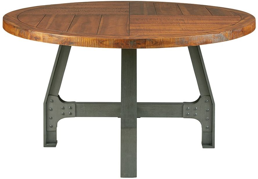 Thick solid wood planks recall time worn warehouse floors. Frames echo the cast iron machine bases during the turn of the century factories. The warmth of the amber tones in the acacia wood, combined with the graphite finishes on the wood frames give you a memorable set. The round dining table sits six for all of your family gatherings. Assembly required.