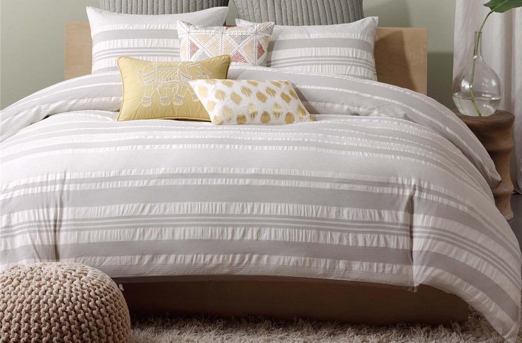 INK+IVY Lakeside is the perfect neutral collection for any room in your home. The light grey stripes are printed on 200 thread count cotton fabric with a seersucker finish adding value to your bedding. For a casual, clean look for any room in your home, this duvet cover features a button closure. A duvet cover is a protective cover for your comforter, most likely for your down comforter. Sometimes it’s referred to as a comforter cover. Duvet covers are not filled. It has an opening where you can insert your comforter. Filler not included.
