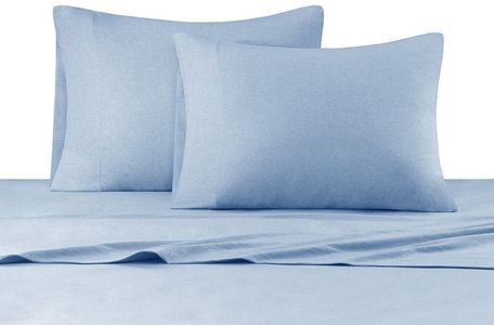 Made from 100% cotton, the jersey knit sheet set will remind you of the comfort of your favorite T-shirt. The sheet set features heathered colors for a relaxed casual look. It's soft, durable, and machine washable for easy care and is perfect for year-round use. The fitted sheet fits up to a 16" mattress height. Includes a fitted sheet, flat sheet, and a pillowcase for twin size.Read More