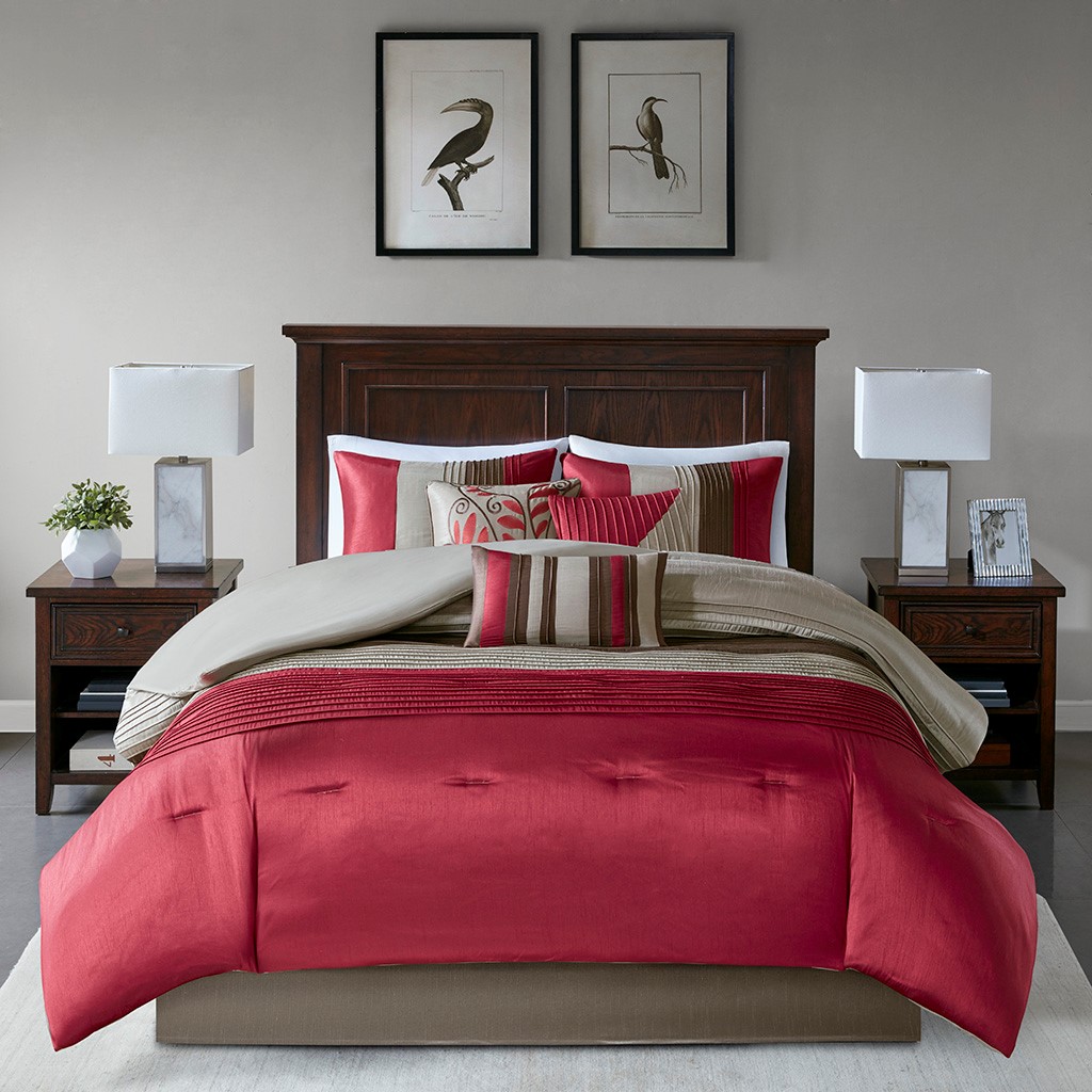 A modern twist to a classic color block bed. Amherst is made from a faux silk texture with pleating details to give it an update to a classic look. Features colors of crimson red, tan, and brown.