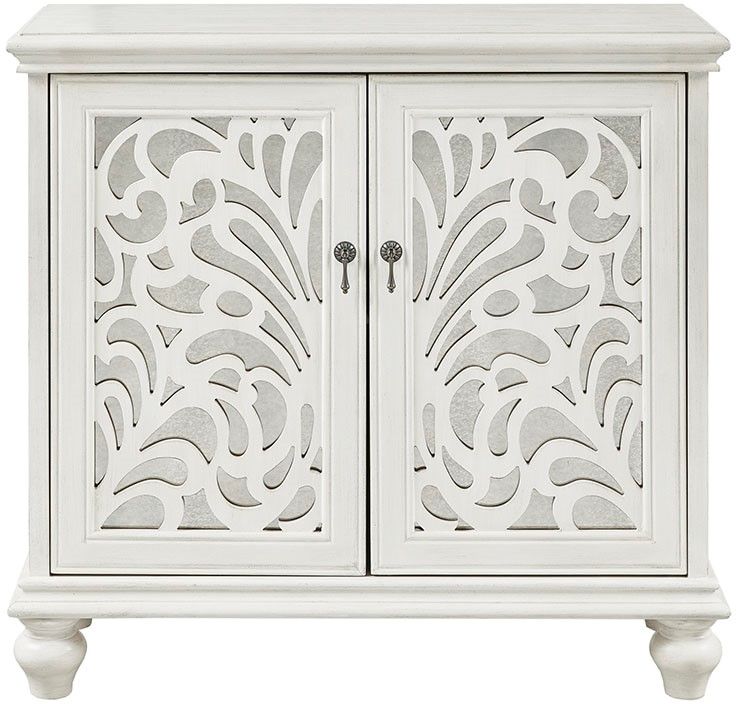 The Madison Park Malone 2 Door Accent Chest offers a chic storage solution to your home decor. This accent chest features carved wood details on the antique mirror door panels, creating an eye-catching and ornate look. Magnetic door catches keep the doors secured, while an inner shelf provides plenty of storage space for your essentials. Showcasing an antique cream finish and bun feet, this 2 door accent chest brings a charming update to your home.Read More