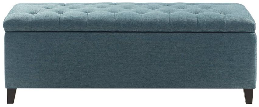 This modern storage bench accentuated with button tufting provides ample storage and features an elegant peacock blue fabric with rich espresso legs. No assembly required.