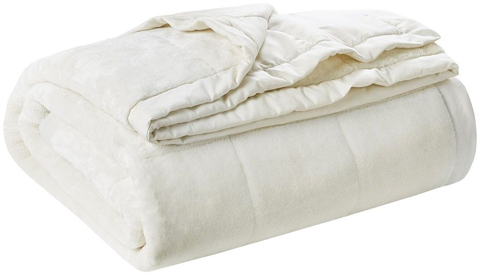 Wrap yourself in the soft plush comfort of the Madison Park Coleman Reversible Down Alternative Blanket. This ivory blanket features a soft plush face that reverses to a solid microfiber, creating an incredibly rich look and feel. The down alternative filling is kept in place by box sewing to provide warmth and comfort for any season. Great for layering on your bed or for individual use, this reversible down alternative blanket adds casual comfort to your space and is machine washable for easy care.