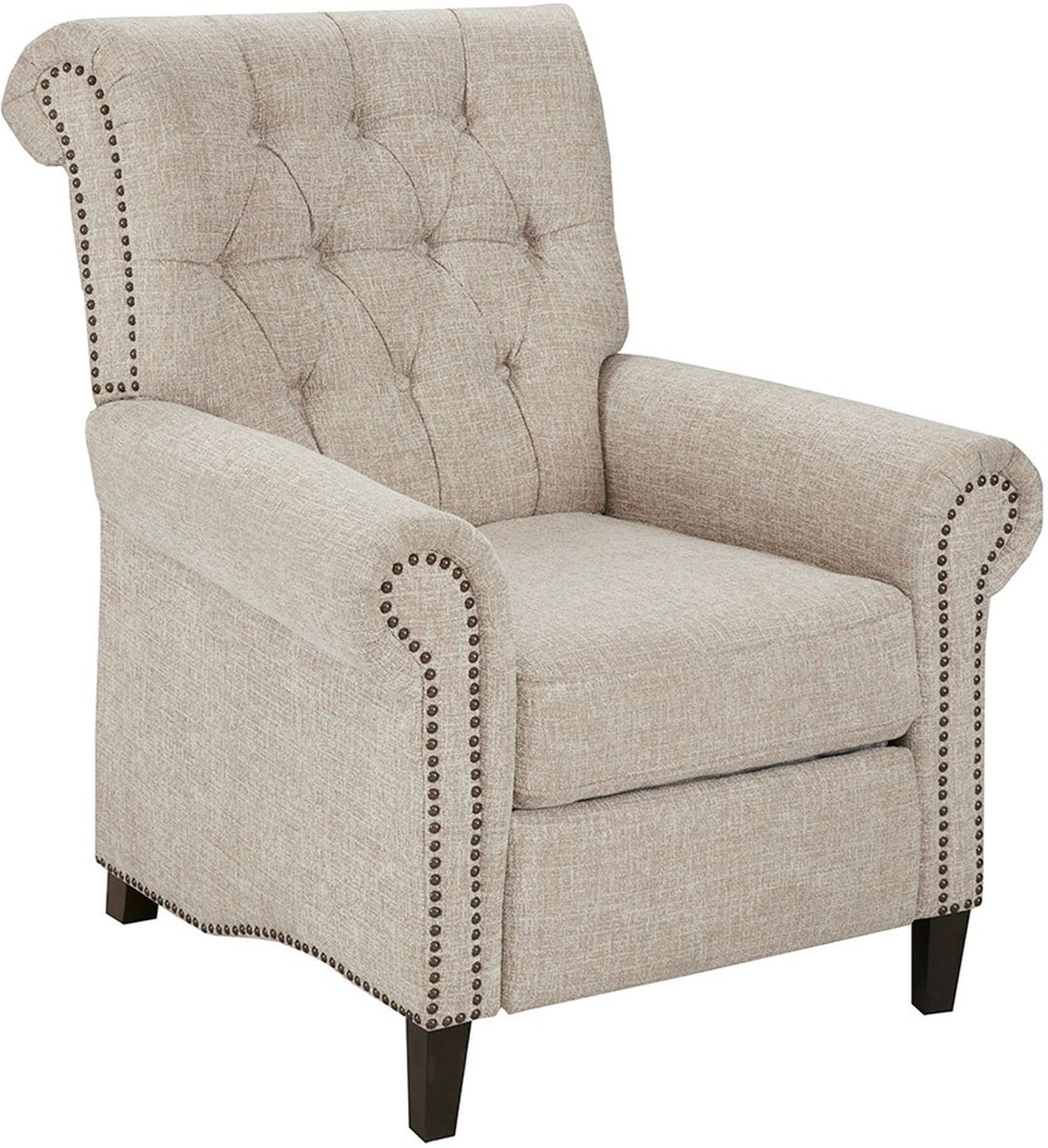 Update your living space with the elegant transitional style of the Madison Park Aidan Push Back Recliner. Rounded arms and a high rounded back give this recliner chair a simple, but beautiful silhouette. The tufted back and bronze nail head trim add an elegant touch to the design, while the removable cushion provides exceptional comfort.Read More