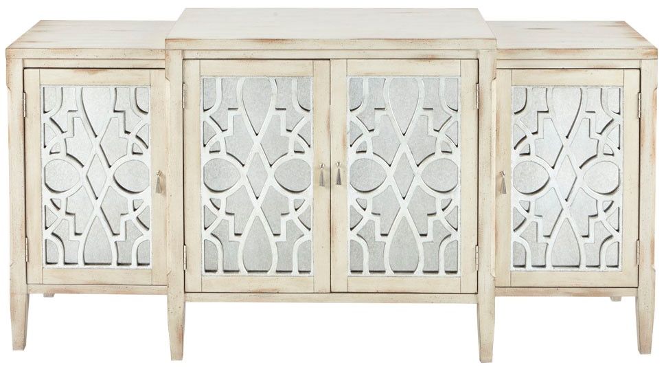 Introduce a natural elegance to your decor with the Madison Park Folio Buffet. Featuring an antique white and silver leaf wood finish, this buffet provides plenty of space to store your flatware and glasses. The four doors stay securely shut with magnetic catches and open up to reveal an adjustable shelf.Read More