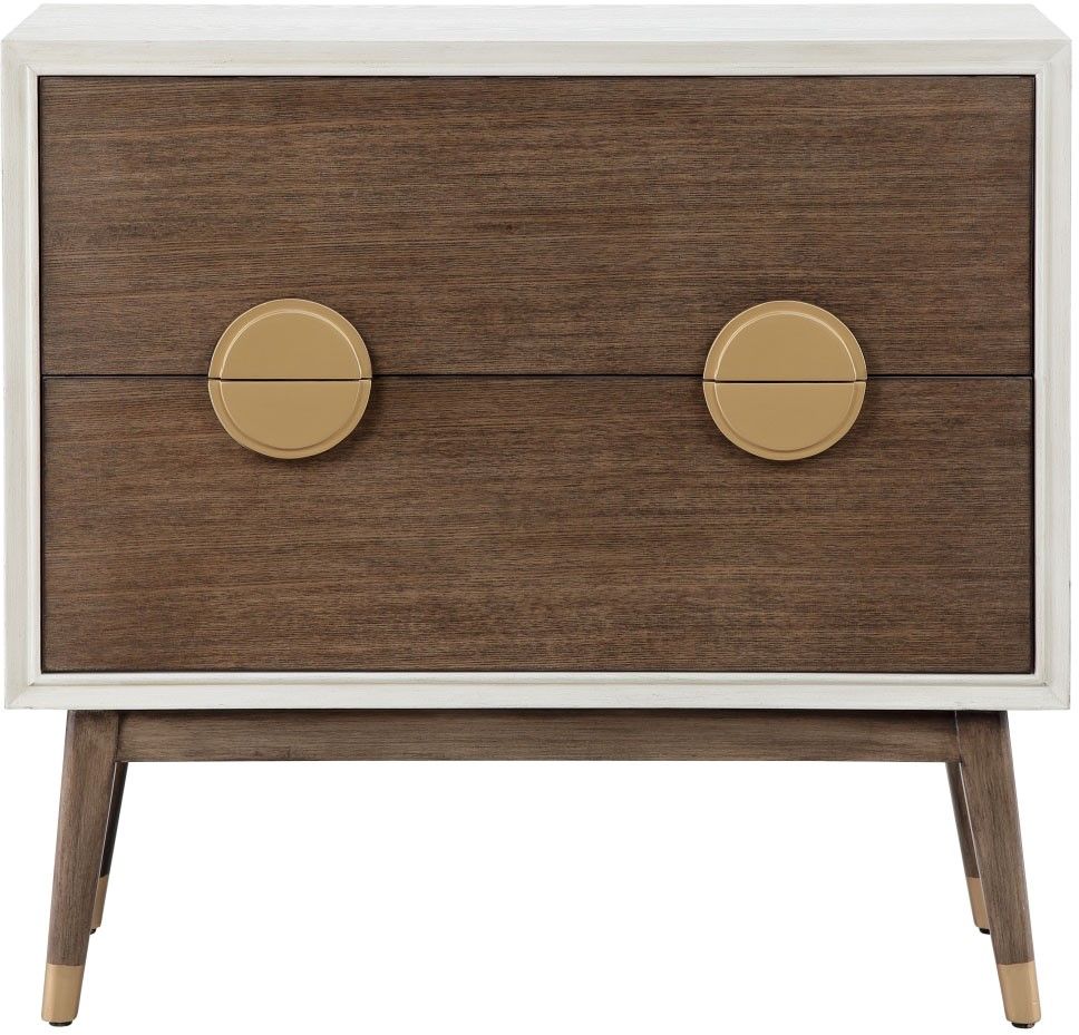 The Madison Park Caterina 2-Drawer Accent chest offers a stunning mid-century update to your home decor. This accent chest features a white outer frame that is contrasted by the pecan wood finish on the drawers. Each drawer has a gold finish on the pull-out knobs that add an elegant touch to design and the wood legs flaunt a dark coffee finish to complete the mid-century design. Providing plenty of storage space, this 2-drawer accent chest brings functionality and style to your home decor.