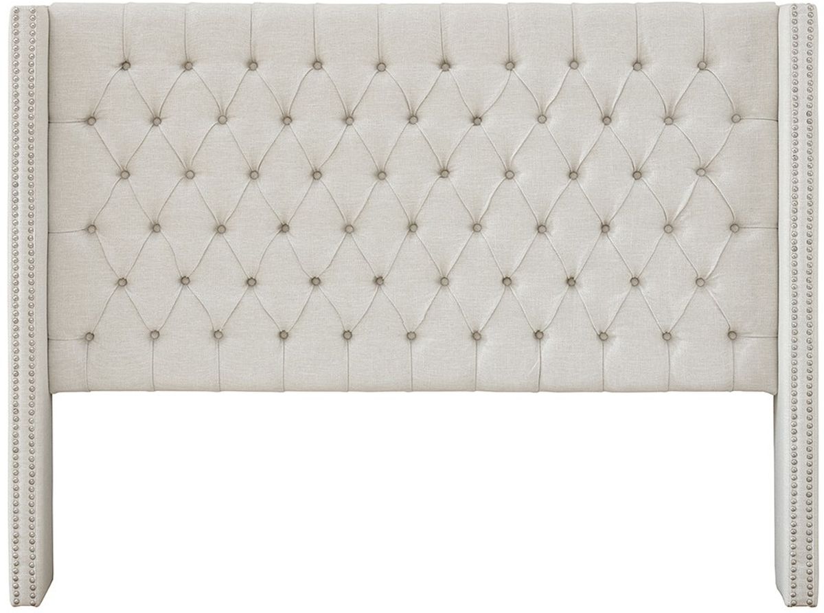 Promote relaxation and style with this glamorous queen size headboard. The upholstered headboard showcases clean and elegant lines with tufted buttons for added charm. The wing back design creates a vintage look, while the silver nail head trim provides a subtle touch of class. A wood frame and metal legs in a black finish provide exceptional support and sturdiness. The soft cream color of this upholstered headboard offers a stylish versatility to match any bedroom décor. Assembly is required.
