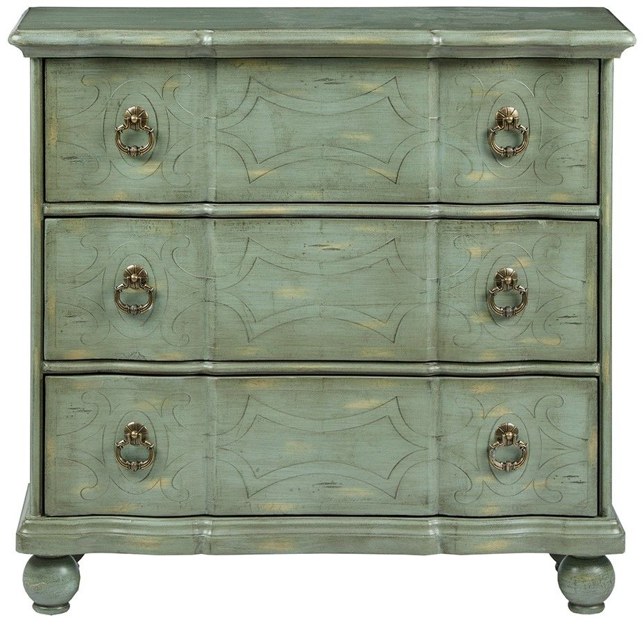 This hand painted accent chest with its blue-green antiqued finish and scrolling work detailing will add flair to any extra space.