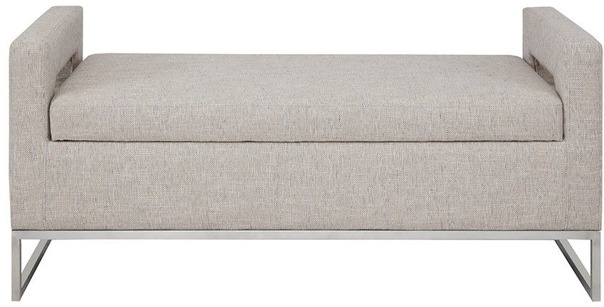 The Madison Park Crawford Storage Bench offers the perfect blend of style and functionality. This bench features open sides upholstered in a soft grey fabric and straight metal legs with a brushed silver electroplate finish, for a chic transitional look. The attached cushion on the rectangular seat provides exceptional comfort and opens to an ample space to store your blankets and other essential items. Perfect for your living room, bedroom, or entryway, this upholstered storage bench beautifully complements any décor. No assembly required. Max weight capacity: 300 lbs.