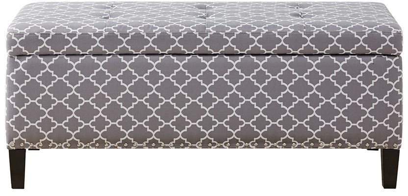 This modern storage ottoman accentuated with button tufting provides ample storage and features an elegant grey fretwork fabric with black noir legs. Assembly required.