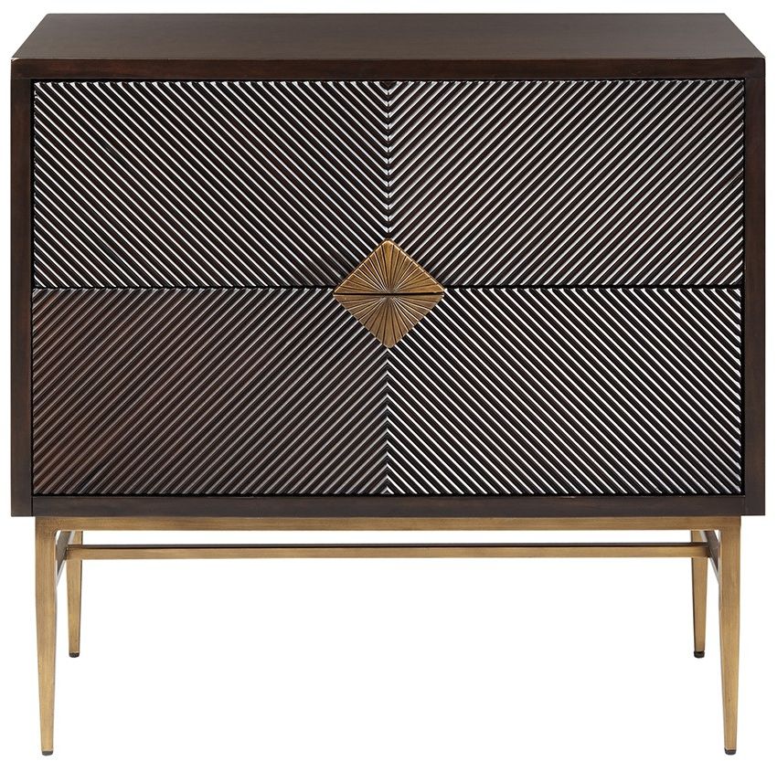 Add a touch of class to your home with this sophisticated 2 drawer accent chest. Elegance meets functionality with its hand carved drawer fronts accentuated, bronze metal base, and matching bronze finish hardware. This accent cabinet is perfect for the living room, home office, or entryway. Assembly is required.
