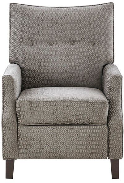 Relax in the comfort of the Madison Park Marissa Push Back Recliner. This reclining chair is upholstered in a mushroom colored fabric that creates a warm and welcoming look. The dark coffee wood finish on the solid wood legs complements the upholstery, while a simple button detailing on the back adds an elegant touch. With a high back and track arms, this recliner brings comfort and a chic transitional touch to your living room decor.