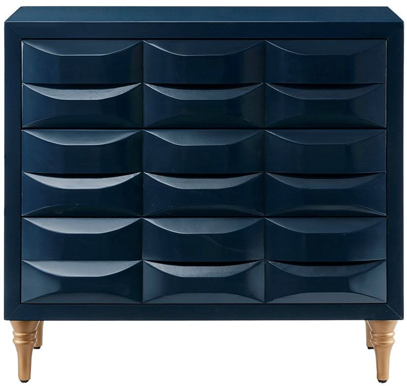 Accent your space with the Madison Park Rubrix 3 Drawer Chest. Expertly designed, this wood chest features three drawers with hidden handles that open up to reveal ample storage spaces. The navy gloss finish of the chest is complemented by the gold metal finish on the legs, creating an exquisite look.Read More