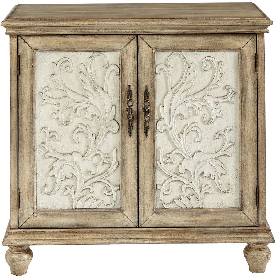 The Madison Park Driscoll 2-Door Cabinet offers a perfect blend of functionality and style for your home decor. This accent chest features a floral design on the cream-hued door panels that adds an elegant touch to the design. The natural-hued frame and legs complement the doors, creating a rich contrasting farmhouse look. With a single shelf to help organize your essentials, this 2-door cabinet brings a rustic charm and additional storage to your living space. Leg assembly is required.