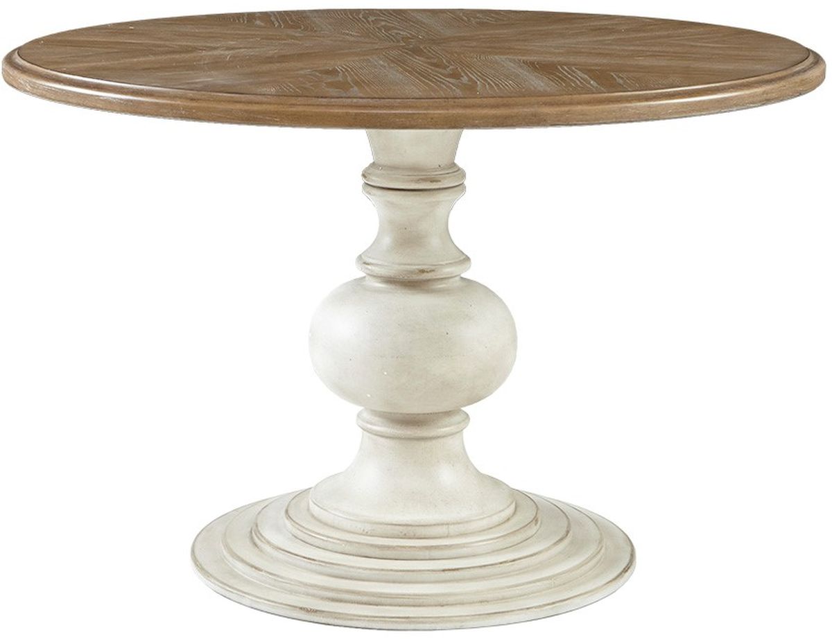 The Madison Park Lexi Dining Table provides a charming farmhouse allure for your dining room décor. This round dining table features a diamond veneer top in a reclaimed walnut wood finish. An antique cream finish on the pedestal base beautifully complements the table top, creating a warm farmhouse look. With its simple design, this round dining table pairs easily with your décor and serves as the focal point of your dining space. Assembly is required and tools are included for your convenience.