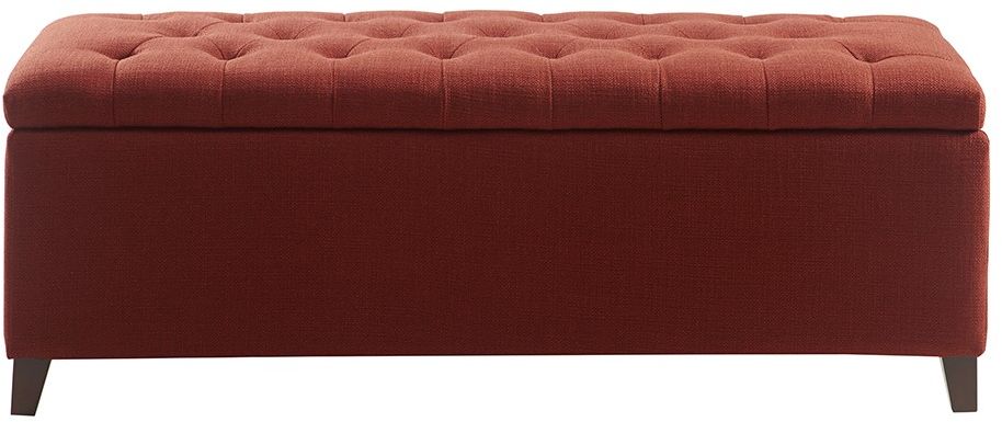 This modern storage bench accentuated with button tufting provides ample storage and features an elegant rust red fabric with rich espresso legs. No assembly required.