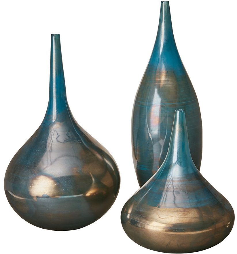 Add a splash of color to your home décor with these glassware vases. Featuring a blue and metallic color palette, these vases are perfect for holding flowers or simply being displayed on an accent table. This set includes three vases, each coming in a different size.